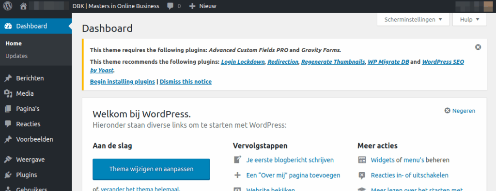 Ons thema geeft zelf aan welke standaard plugins geïnstalleerd moeten worden. Er wordt de vraag gesteld om deze plugins te installeren, en met een druk op de knop is dat ook gebeurd. Bij deze standaard plugins valt te denken aan: Login Lockdown, WordPress SEO, Regenerate Thumbnails, Gravity Forms en Advanced Custom Fields PRO. Soms zijn er voor een specifiek project nog extra plugins nodig. Deze voegen we handmatig toe.